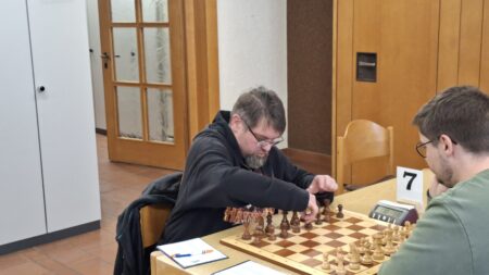 Markus Weber (7) kam schnell zur Sache. Mit Turm und schwarzfeldrigem Läufer auf beiden Seiten, aber einem schmerzhaften Doppelbauern nur auf seiner Seite hatte Markus einen strukturellen Nachteil, konnte die Bauern aber so blockieren, dass es keinen Unterschied mehr machte – die Stellung war zu einem Unentschieden festgelegt.