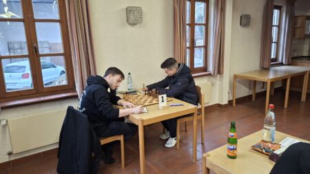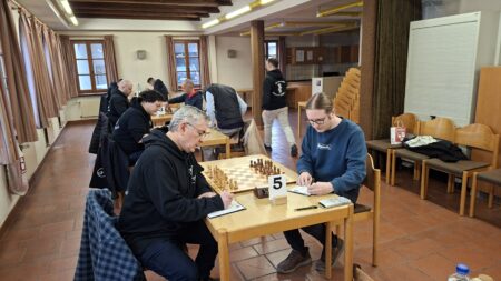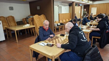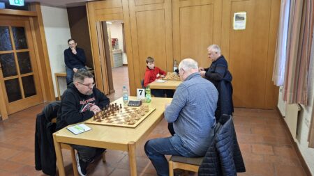 Klaus Höflinger (3) hatte seine Partie in der Endphase eigentlich gut im Griff, die Dinge waren allerdings komplizierter, als sie aussahen. Letztendlich entstand eine Situation, in der Remis durch Zugwiederholung für beide Spieler den besten Ausgang darstellte.
