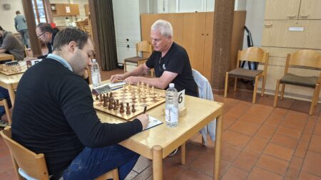 Vier Brettpunkte waren damit eingetütet, aber für den fehlenden halben Zähler reichte es leider nicht mehr, denn zu diesem Zeitpunkt standen die beiden noch laufenden Partien alles andere als gut aus unserer Sicht: Bernd Grill (1) mühte sich gegen seinen großmeisterlichen Gegner mit den schwarzen Steinen redlich, seine Schwächen zu decken, wurde aber letztlich sicher überspielt und strich schon bald die Segel. Nicht besser erging es Dietmar Kessler (3), der in ein Turmendspiel mit zwei Minusbauern abwickeln musste, um zu überleben und ohne Gegenspiel schon bald aufgeben musste. Somit hatten die mit zwei Profis verstärkten Gäste auf den letzten Metern das Unheil noch abwenden und sich eine Punkteteilung sichern können. Alles in allem stand damit ein gerechtes Unentschieden unterm Strich, auch wenn das Geschehen gerade an den Brettern 2 und 4 ganz anders – und zwar jeweils in beide Richtungen – hätte verlaufen können.