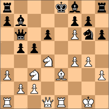 Nils hatte zuvor schon einige gute Gelegenheiten ausgelassen und hätte in dieser vogelwilden Stellung besser nicht 16. Le3-f2+?! gezogen, sondern stattdessen mit 16. Sd4-f5! immer noch entscheidenden Vorteil erlangen können. Was er leider übersehen hatte, war, dass nach 16… 0-0-0 die Abwicklung 17. f6xg7 Db6-c6 18. Sc3-d5! ihm eine klare Gewinnstellung einbringt, weil Schwarz weder auf d5 noch g7 nehmen kann ohne entscheidendes Material zu verlieren.