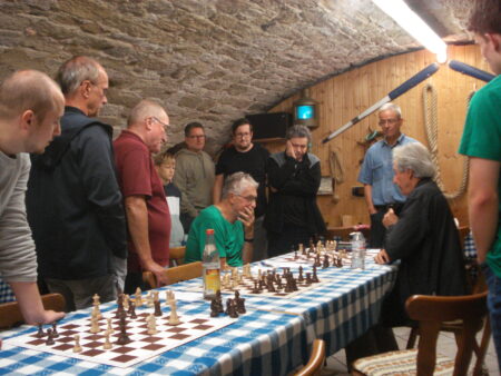 Für Hans Leutz (5) war lange Zeit ein leichter Vorteil spürbar, doch im Versuch, diesen auszuweiten, kippte die Stellung in Richtung Endspiel langsam immer mehr zu seinen Ungunsten, bis die gegnerischen Figuren schließlich so gut standen, dass die Mattdrohung unvermeidlich war.